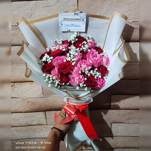 - Buket mawar merah, putih, dan pink.